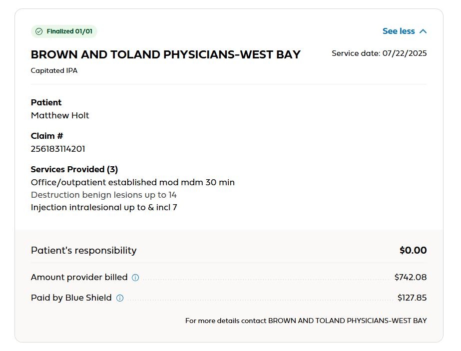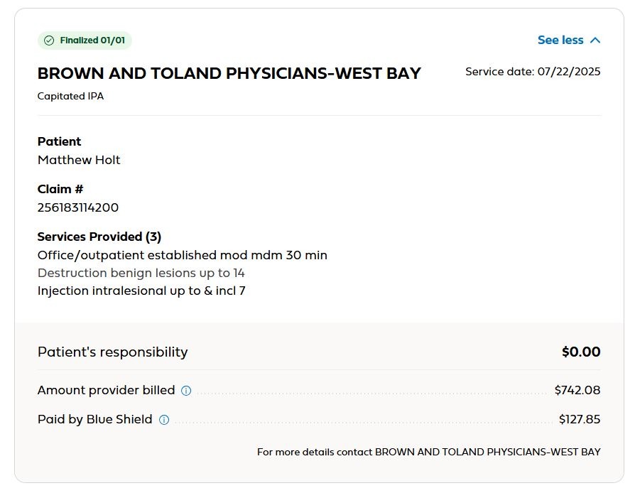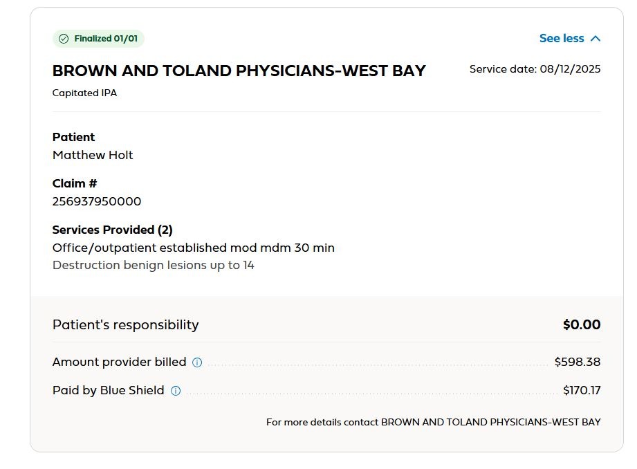But why Blue Shield/Brown & Toland allows them to bill three times for what’s basically one service is beyond me. And why are they billing different amounts for basically the same visit?