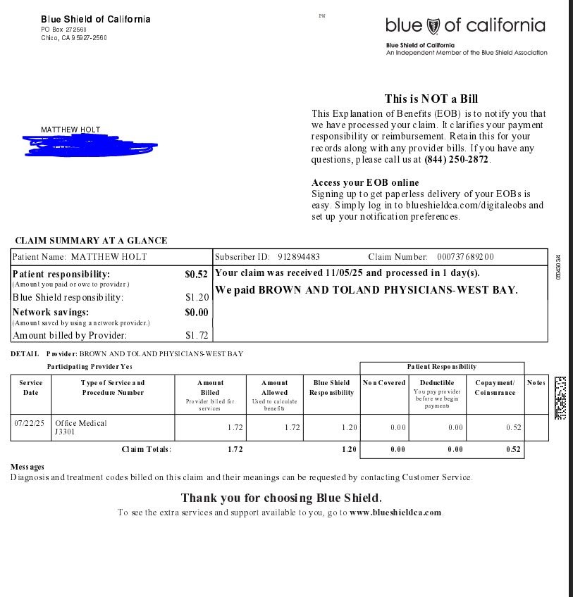 And why I am being charged a co-insurance for one of the four identical visits I made is also beyond me. (Yes, I will call Brown & Toland and ask…. But the Blue Shield EOB suggests I owe nothing).