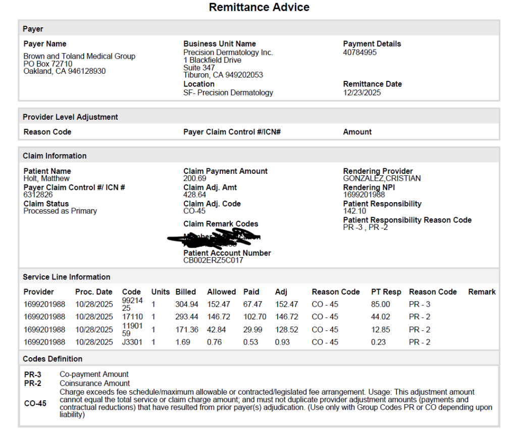 Meanwhile he sent me the EOB or remittance advice that Brown & Toland sent him.